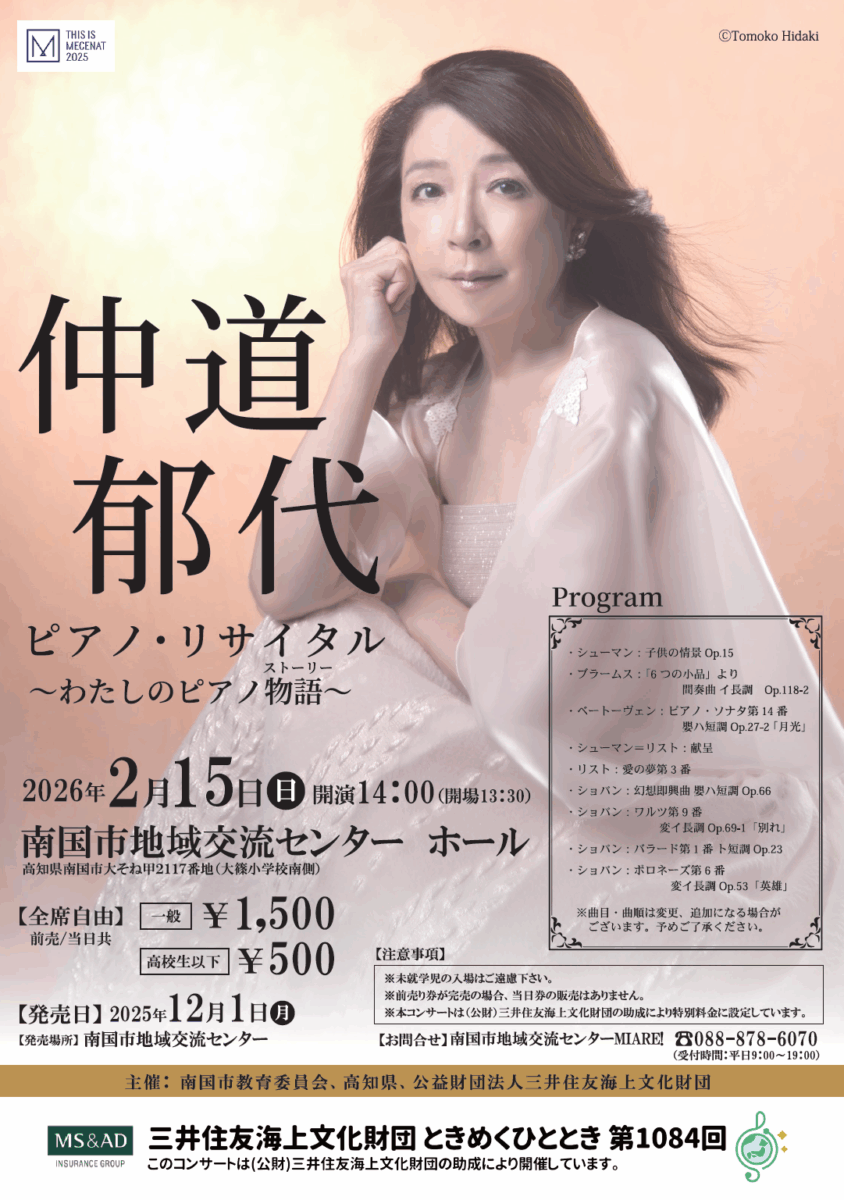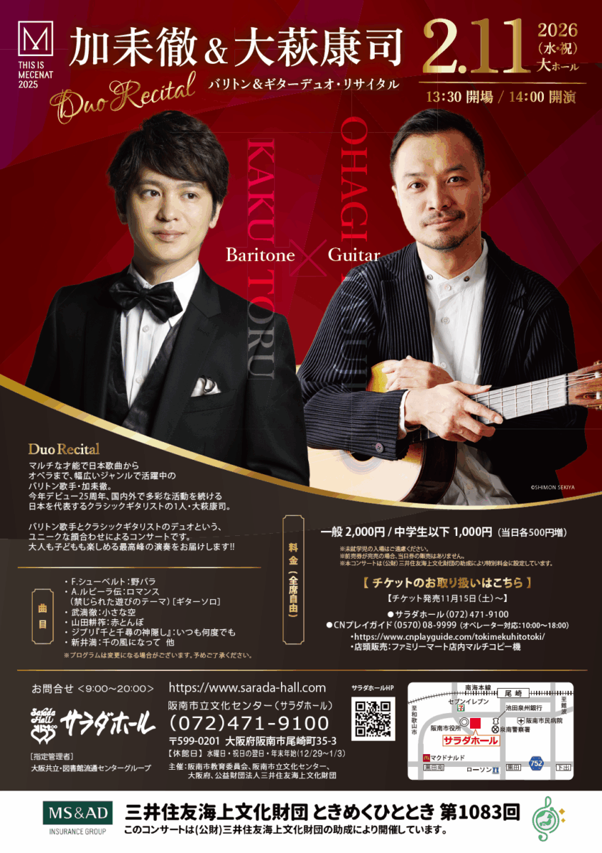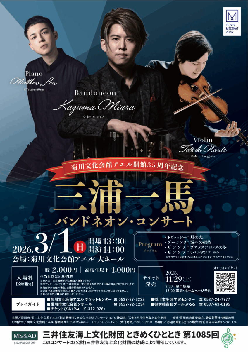 音楽 …企業メセナ協議会が認定したメセナ活動 Kyoto × Classics Vol.15 法然院 ~東山の森に響くチェロ四重奏の愉しみ~ 2025/10/29~2026/03/31 ローム ミュージック チャンネル ローム株式会社/公益財団法人 ローム ミュージック ファンデーション オンライン プリズムステージ 大津敦ファゴットリサイタル 2026/03/24 HITOMIホール 公益財団法人メニコン芸術文化記念財団 中部 北村 陽(チェロ) 2026/03/20 TOPPANホール TOPPANホールディングス株式会社/TOPPANホール 関東 児玉桃 ピアノリサイタル 2026/03/14 ガトーフェスタ ハラダ 本社1階 エスポワールホール 株式会社原田・ガトーフェスタ ハラダ 関東 SQW #170 クァルテット・ウィークエンド 2025 – 2026「クァルテット・エクセルシオ×レグルス・クァルテット」 2026/03/07 第一生命ホール 第一生命保険株式会社/トリトン・アーツ・ネットワーク/第一生命ホール 東京 向井山朋子 ピアノコンサート 2026/03/07 ガトーフェスタ ハラダ 本社1階 エスポワールホール 株式会社原田・ガトーフェスタ ハラダ 関東 ゴーティエ・カプソン(チェロ)&フランク・ブラレイ(ピアノ) ベートーヴェン《チェロ・ソナタ》全曲 2026/03/06 TOPPANホール TOPPANホールディングス株式会社/TOPPANホール 関東 ベルリン古楽アカデミー I ―Pure Bach/II ―Bach&Beyond 2026/03/04~2026/03/05 TOPPANホール TOPPANホールディングス株式会社/TOPPANホール 関東 三浦一馬バンドネオン・コンサート 2026/03/01 菊川文化会館アエル 大ホール MS&ADインシュアランスグループ/公益財団法人三井住友海上文化財団 中部 宮田 大 Dai-versity 第4回 フランス音楽と狂言の世界 2026/02/28 第一生命ホール 第一生命保険株式会社/トリトン・アーツ・ネットワーク/第一生命ホール 東京 庄司紗矢香 &ジャンルカ・カシオーリ デュオ・リサイタル 2026/02/26 住友生命いずみホール 住友生命保険相互会社/一般財団法人住友生命福祉文化財団 近畿 新日本フィルハーモニー交響楽団 プレミアム・コンサート in 川崎 2026/02/23 ミューザ川崎シンフォニーホール ローム株式会社/公益財団法人ローム ミュージック ファンデーション 関東 ライフサイクルコンサート 子どもといっしょにクラシック 「音楽と絵本」コンサート『スーホの白い馬』 2026/02/21 第一生命ホール 第一生命保険株式会社/トリトン・アーツ・ネットワーク/第一生命ホール 東京 アコム“みる”コンサート物語パンフレット表紙 「笑顔のおてつだい」バリアフリーコンサート アコム”みる”コンサート物語 2025/05/31~2026/02/15 アコム株式会社 全国 仲道郁代ピアノ・リサイタル ~わたしのピアノ物語(ストーリー)~ 2026/02/15 南国市地域交流センター ホール MS&ADインシュアランスグループ/公益財団法人三井住友海上文化財団 四国 天満敦子 ヴァイオリンコンサート 2026/02/14 ガトーフェスタ ハラダ 本社1階 エスポワールホール 株式会社原田・ガトーフェスタ ハラダ 関東 加耒徹&大萩康司 バリトン&ギター デュオ・リサイタル 2026/02/11 阪南市立文化センター サラダホール 大ホール MS&ADインシュアランスグループ/公益財団法人三井住友海上文化財団 近畿 いずみシンフォニエッタ大阪 第55回定期演奏会 これからの世界、これからのいずみシンフォニエッタ大阪 2026/02/11 住友生命いずみホール 住友生命保険相互会社/一般財団法人住友生命福祉文化財団 近畿 1 2 … 53 次へ