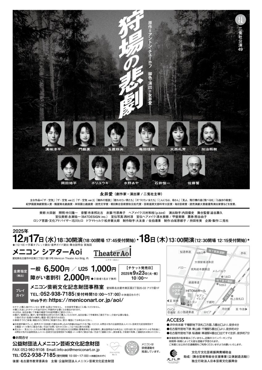 演劇界のみならず社会に衝撃を与えた『空気』シリーズ最終話『ザ・空気 ver.3 そして彼は去った…』(2021)以来の新作です。『桜の園』『かもめ』などの戯曲で世界的に知られるロシアの作家・チェーホフが24歳の時に書いた長編ミステリー『狩場の悲劇』(1884)をベースに、同作家による他の作品のエッセンスを散りばめ、永井愛独自の視点を盛り込んで新たな劇世界を創造します。帝政ロシアの人間社会をレポートしたチェーホフと、市井の人々の姿に日本社会の時代や様相を投影してきた永井愛の、時間と空間を飛び越えた奇跡のコラボレーションが実現しました。