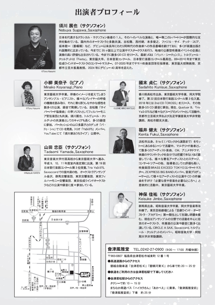 *開演前(13:30~)会津出身のサクソフォン奏者 山浦雅也と陬波花梨率いる”会津サクソフォンプロジェクト”との共演によるプレコンサートを行います。