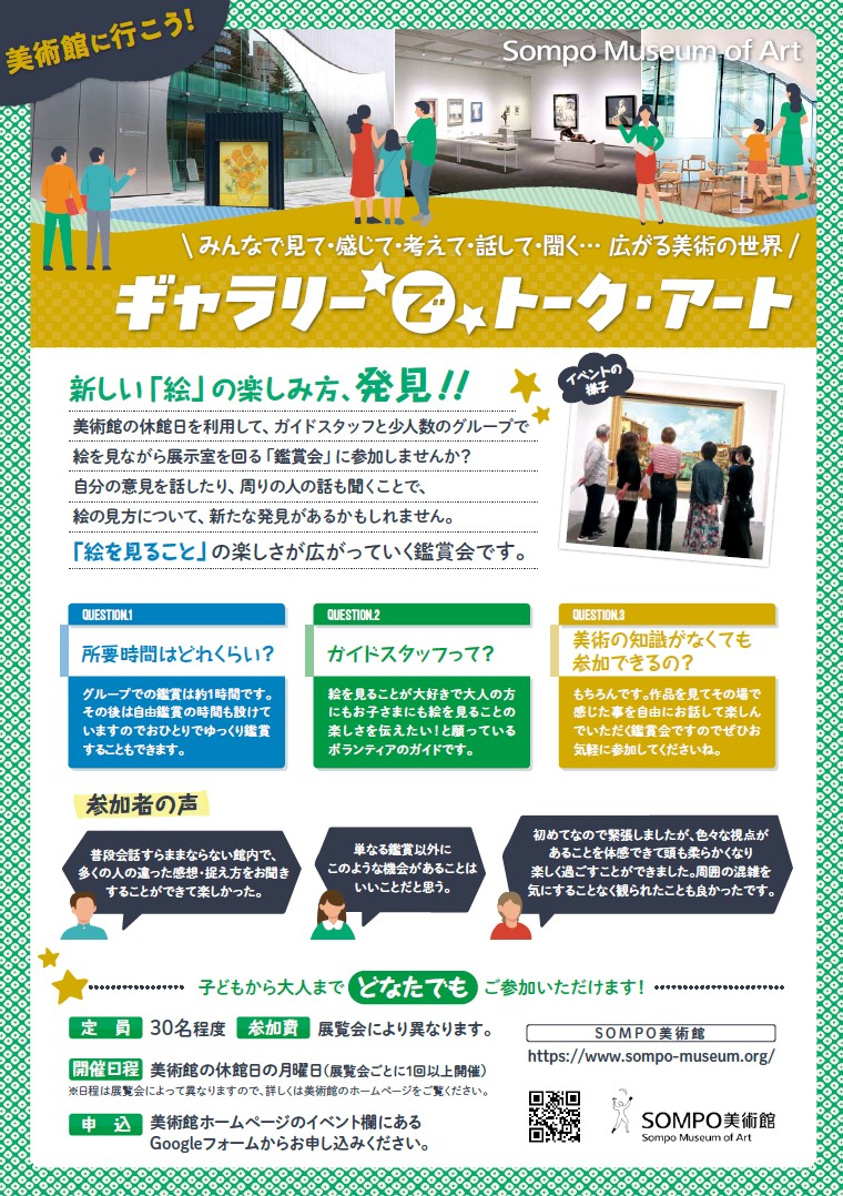 美術館の休館日を利用して、ガイドスタッフと少人数のグループで絵を見ながら展示室を回る「鑑賞の会」に参加しませんか?自分の意見を話したり、周りの人の話も聞くことで、絵の見方について、新たな発見があるかもしれません。「絵を見ること」の楽しさが広がっていく鑑賞会です。