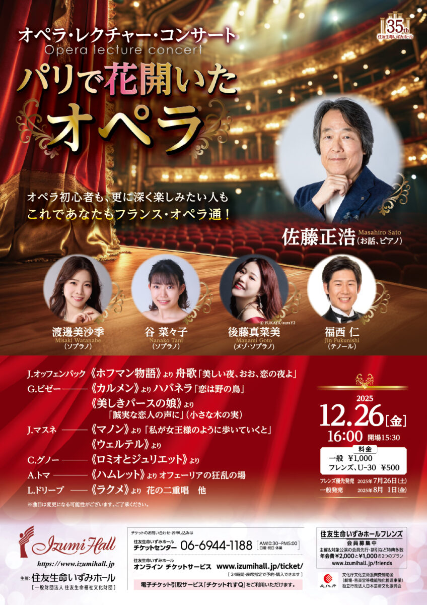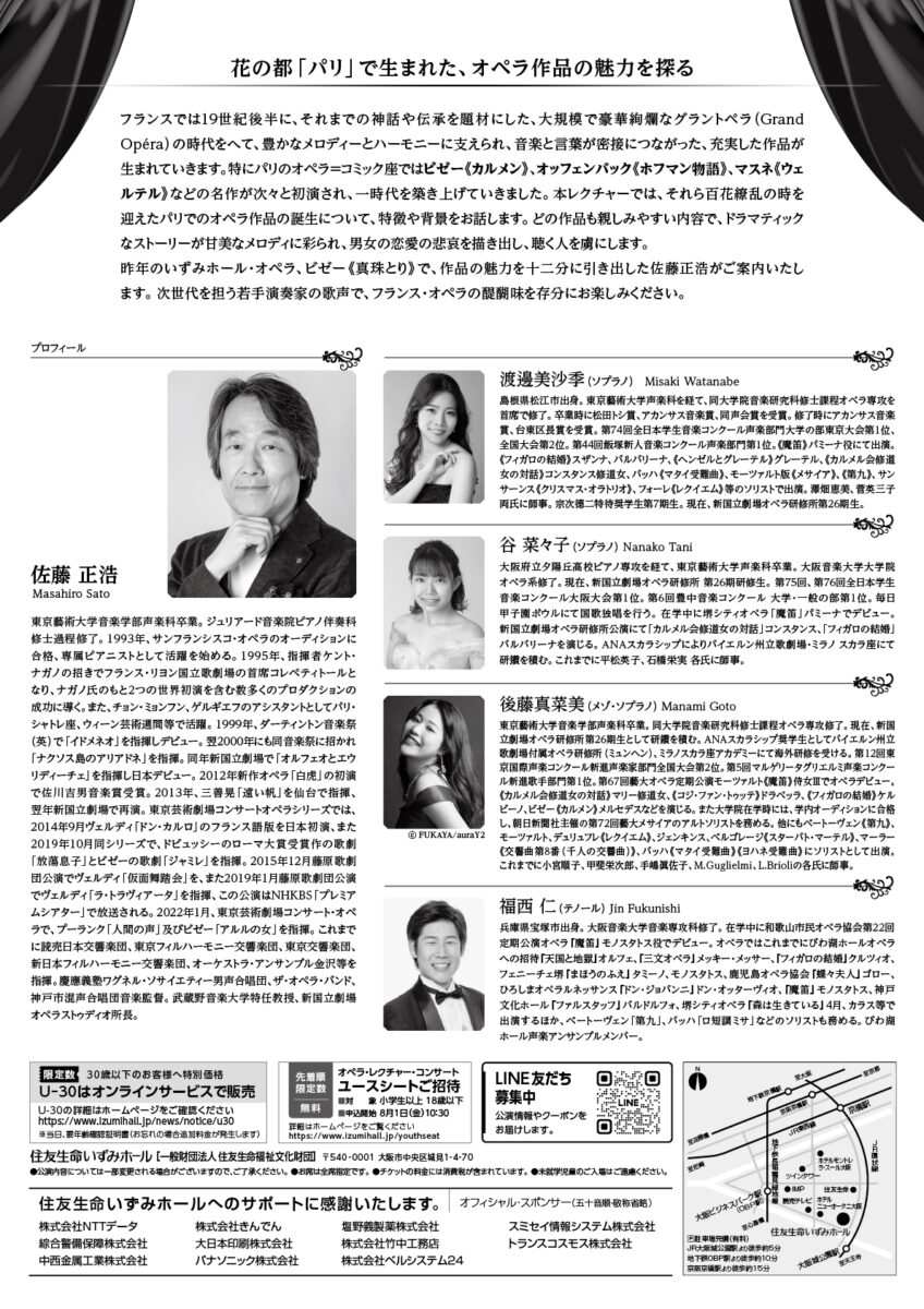 昨年のいずみホール・オペラ、ビゼー《真珠とり》で、作品の魅力を十二分に引き出した佐藤正浩がご案内いたします。次世代を担う若手演奏家の歌声で、フランス・オペラの醍醐味を存分にお楽しみください。