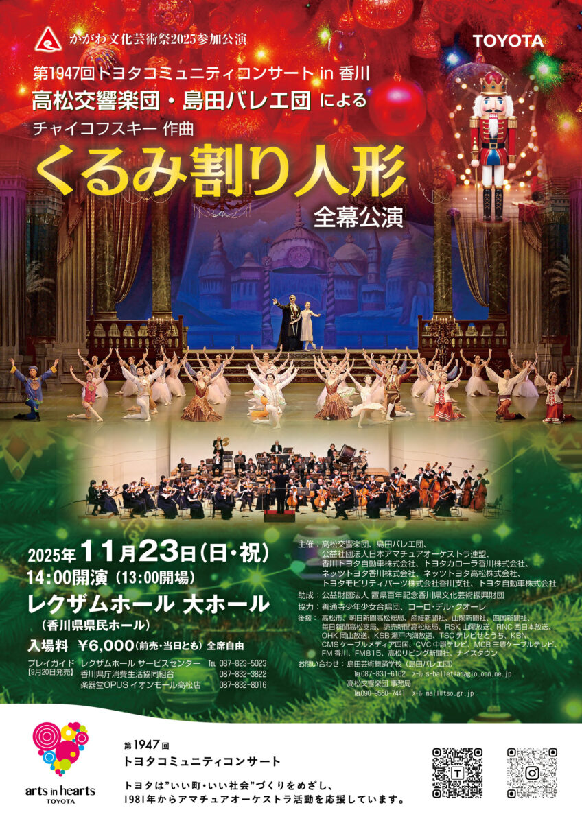 今回の演奏会は、香川県高松市に根差して活動する創立75周年を迎えるオーケストラ「高松交響楽団」と、バレエの教育に力を注ぎ、今年創立80周年を迎える「島田バレエ団」の合同による、チャイコフスキー作曲のバレエ「くるみ割り人形」全幕公演です。東京で活躍するプロのダンサー米沢 唯氏(新国立劇場バレエ団)、秋本康臣氏(元 東京バレエ団)や、島田バレエ団出身ダンサーの米澤真弓氏(牧阿佐美バレエ団)、大川航矢氏(牧阿佐美バレエ団)を招聘し、チャイコフスキーの美しく親しみやすい音楽と、華麗かつ豪華絢爛なバレエをお楽しみ頂けます。今回は、県内の青少年をご招待し、クラシック音楽やバレエの魅力に初めて触れる感動体験をお届けします。