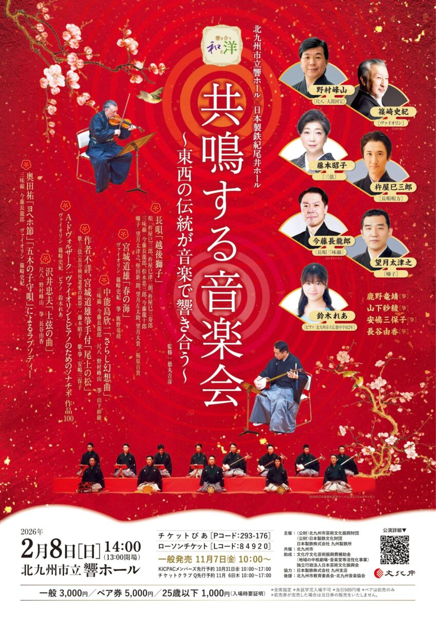 北九州市立響ホールと日本製鉄紀尾井ホールとの共同企画、西洋と東洋の名曲とともに、各界をリードする演奏家たちがコラボレーションします。さらに久留米市開催 賢順記念全国箏曲コンクールの歴代優勝者も出演し、伝統を紡ぐ気鋭の演奏家たちが演奏会を盛り上げます。