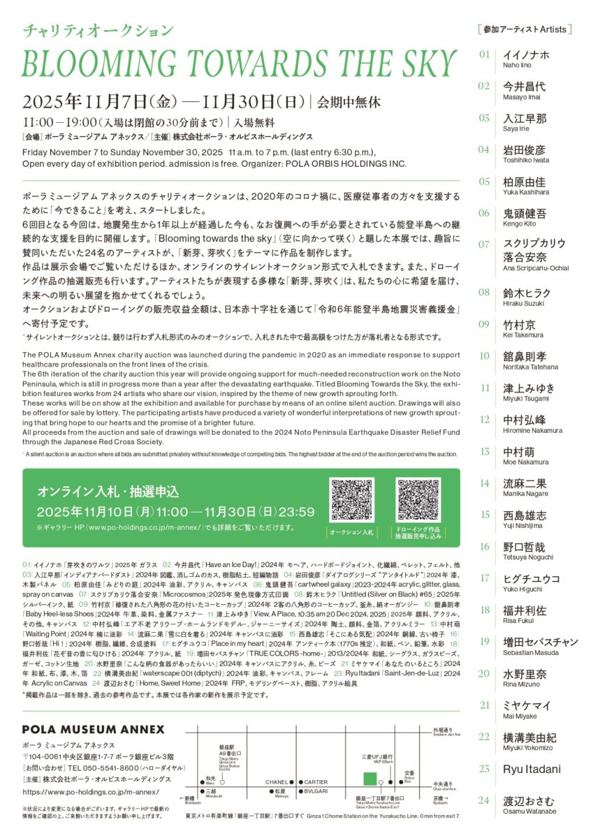 昨年は「ふるさと、故郷、HOME」をテーマに掲げ、能登半島地震で被災された地域への支援を行いました。地震から1年以上が経過した今も能登の復興には多くの課題が残されており、継続的な支援の必要性を感じています。私たちは、この困難な状況から再生し、未来へと向かう能登の姿を今年のテーマ「新芽、芽吹く」に込め、「Blooming towards the sky」展と題し、企画展を開催することとしました。