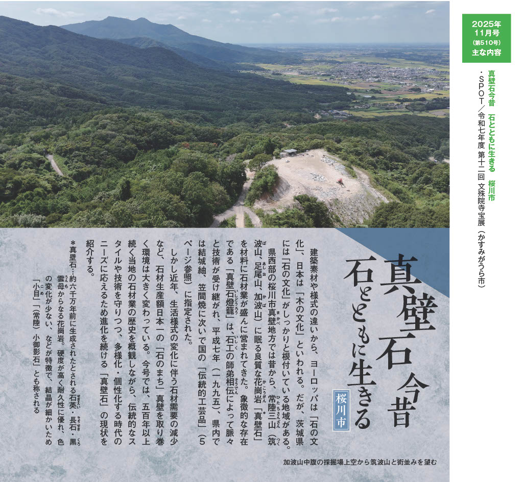 今号では、500年以上続く当地の石材業の歴史を概観しながら、伝統的なスタイルや技術を守りつつ、多様化・個性化する時代のニーズに応えるため進化を続ける「真壁石」の現状を紹介します。