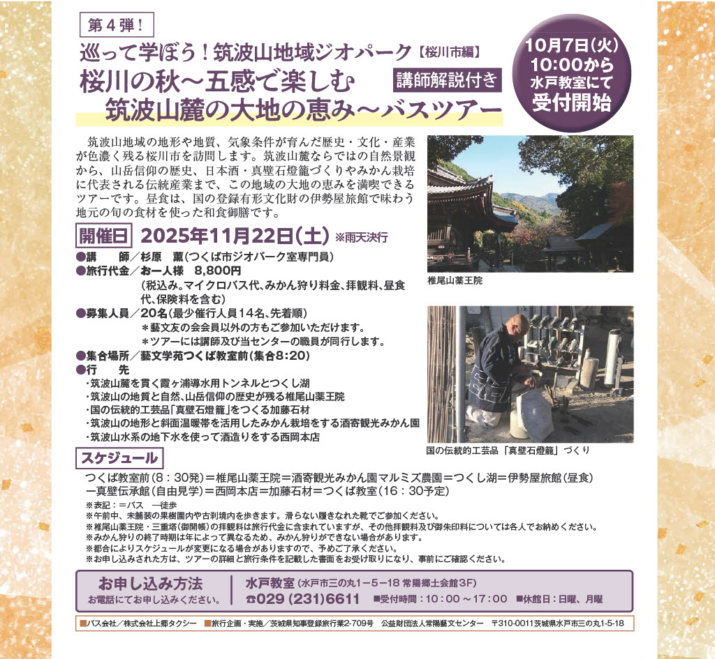 テーマ関連事業として、2025年11月22日(土)に「桜川の秋~五感で楽しむ筑波山麓の大地の恵み」と題してバスツアーを実施します。国の伝統的工芸品「真壁石灯籠」づくりの見学など桜川市真壁町の自然・文化・産業を五感で楽しむツアーです(画像をご覧ください)。