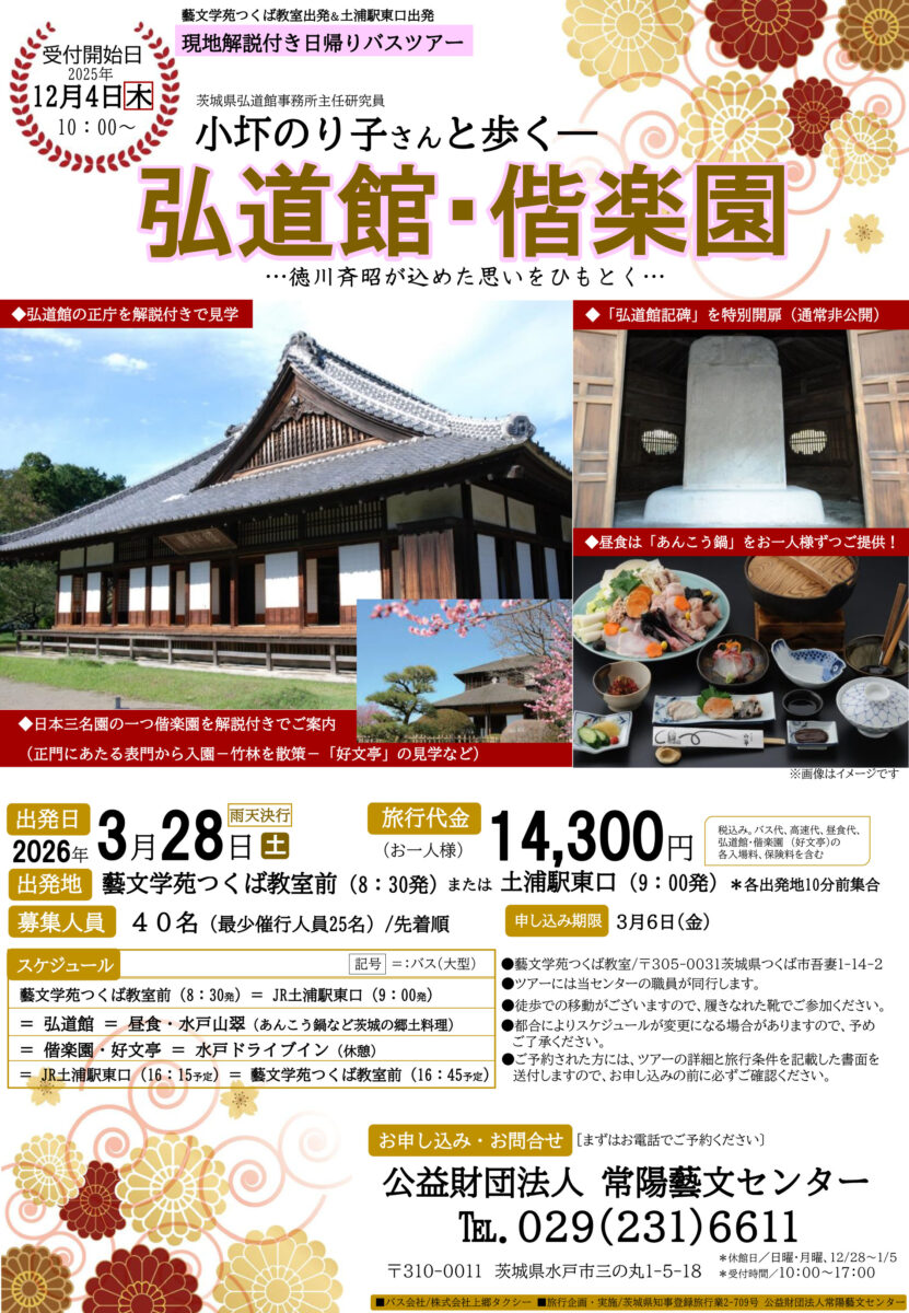 つくば教室前(8:30発)=JR土浦駅東口(9:00発)=弘道館=昼食・水戸山翠(あんこう鍋など茨城の郷土料理)=偕楽園・好文亭=水戸ドライブイン(休憩)=JR土浦駅東口(16:15予定)=つくば教室前(16:45予定)