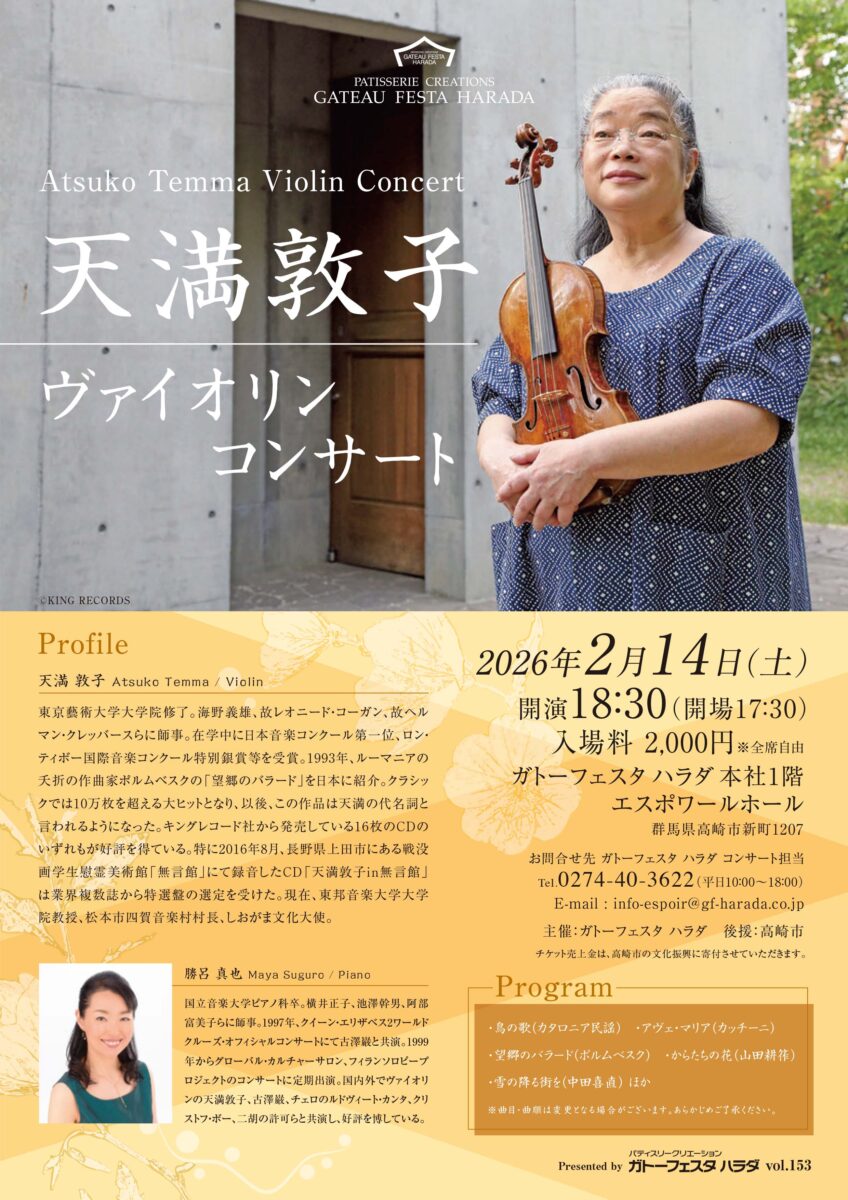広がりのある豊かな音色と詩情あふれる表現でメロディに命を与え、人々の心を揺さぶるヴァイオリン奏者の天満敦子さんと、共演にピアノ奏者の勝呂真也さんをお招きいたします。繊細な技巧と深い感性が紡ぎ出す、魂を込めた演奏をご堪能ください。