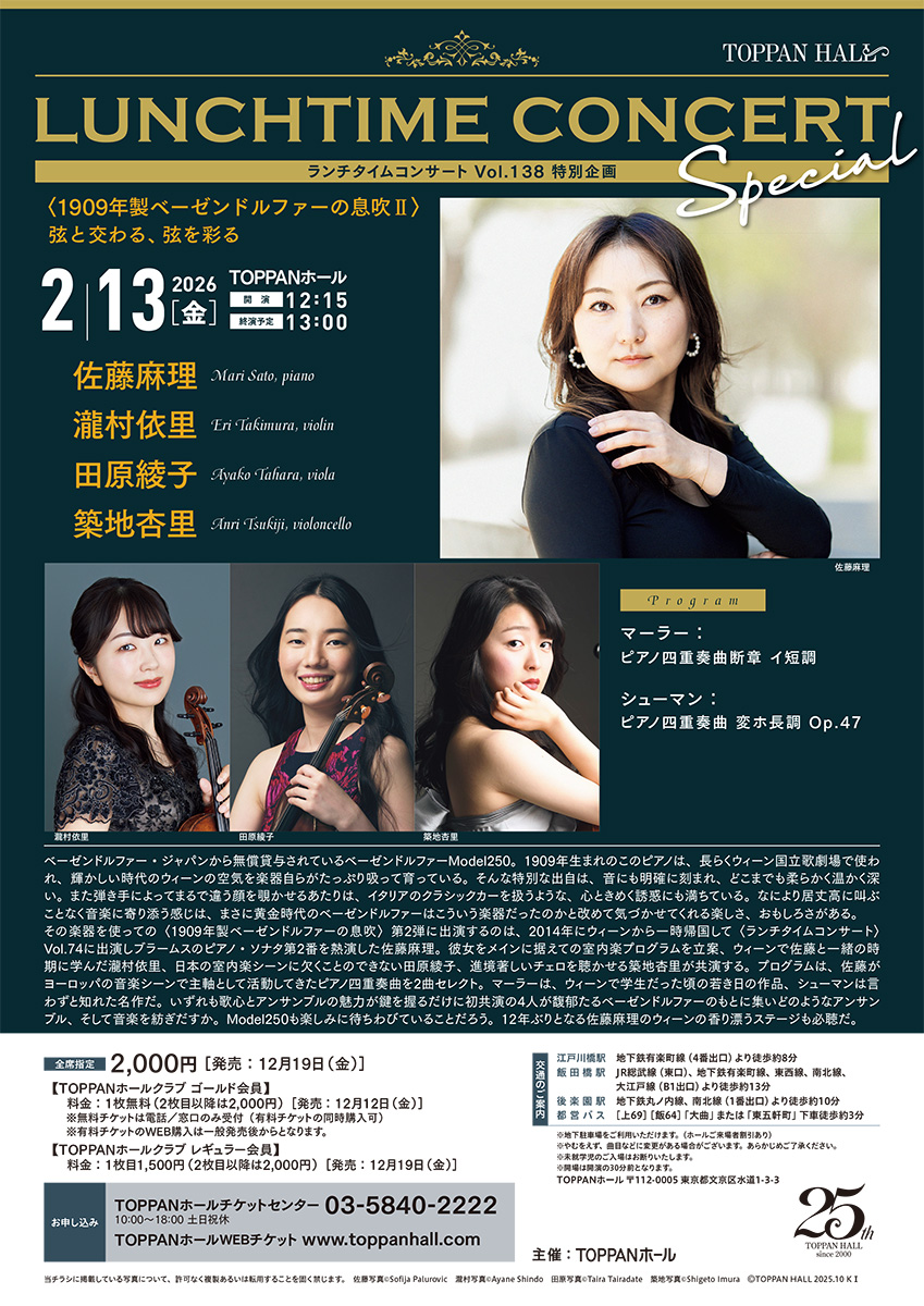 2026年最初の〈ランチタイムコンサート〉は、シリーズ〈1909年製ベーゼンドルファーの息吹〉第2弾。長らくウィーン国立歌劇場で使われ、輝かしい時代のウィーンの空気をたっぷりと吸って育ってきたピアノ、「ベーゼンドルファーModel 250」の馥郁たる響きは、どこまでも柔らかくあたたかく、音楽に寄り添う懐の深さを持っています。今回この特別な楽器と向き合うのは、ウィーンを拠点に活動を展開している佐藤麻理。彼女を中心に、佐藤と同時期にウィーンで学んだ瀧村依里、日本の室内楽シーンに欠くことのできない田原綾子、築地杏里が集結し、充実のプログラムをお届けします。彼女たちが名器「ベーゼンドルファーModel 250」のもと織り成すアンサンブルをどうぞお聴き逃しなく。