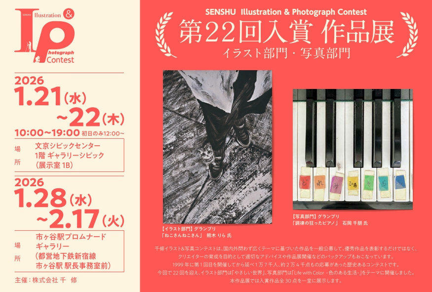 本コンテストは1999年に第1回を開催し、今回で22回目を迎えました。これまでプロアマ問わず、また広い年代の方々からご応募いただき、中には受賞された学生の方が、プロのクリエイターとなり活躍されているお話も伺っております。審査員にアートプロデューサーの伊東順二先生、クリエイティブディレクターの中島信也先生、写真家の宮澤正明先生をお迎えし、入賞作品30点(イラスト部門15点、写真部門15点)が選ばれました。2026年1月21日(水)~1月22日(木)まで文京シビックセンター内のギャラリーシビック(展示室1B)において全入賞作品を一堂に展示。なお、本作品展終了後は、2026年1月28日(水)~2月17日(火)に市ヶ谷駅プロムナードギャラリーにて展示致します。