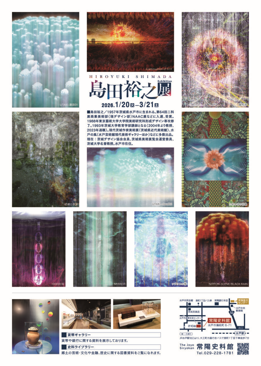 水戸市在住の島田裕之さんは大学在学中からデザインのコンクールにアクリル絵具で描いたイラストレーションを出品し、入選と受賞を重ねました。コンピューターの登場とともにCG(コンピューターグラフィックス)に取り組み、自ら撮影した写真を加工しながら数十層にも重ねていく方法で、揺らぎと奥行きのある作品を制作しています。また母校である茨城大学で教鞭をとり多くの美術家と美術教育者を育てました。