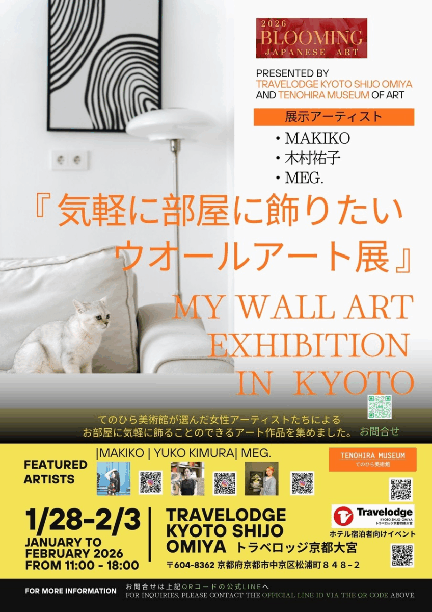 日本、韓国、香港、タイ、シンガポール、マレーシアなどアジア各国でホテルを運営するトラベロッジホテルズアジア社の「トラベロッジ京都四条大宮」と「てのひら美術館」が継続的にトラベロッジ京都四条大宮のホテルゲストラウンジにて、月1回のアート展を開催します。