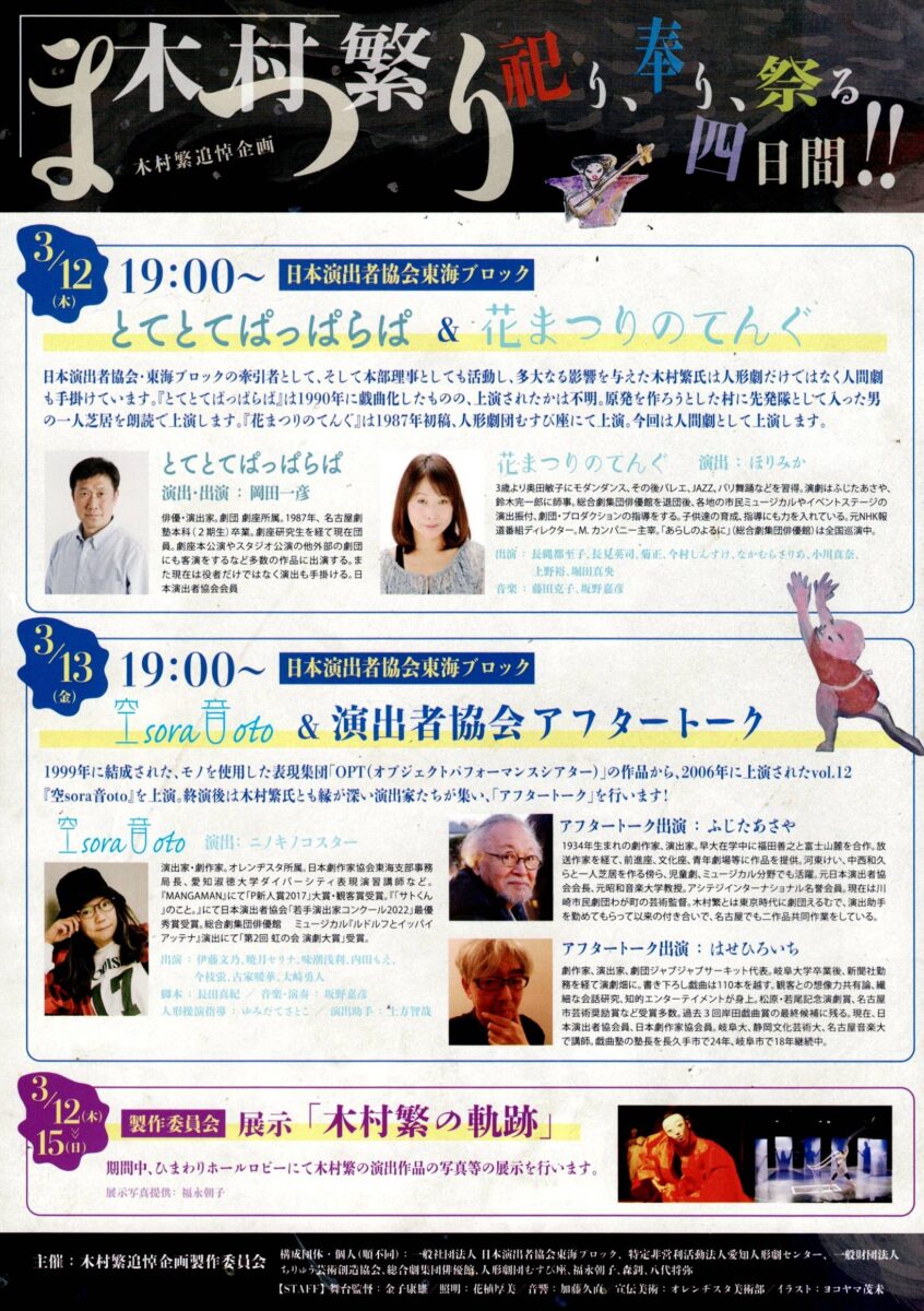 演劇、人形劇、オブジェクトパフォーマンス、伝統人形劇、先駆的なコラボレーションなど多様な表現活動を続けてきた木村繁は、生前「人間と人形の関係を見つめる仕事が残っている、これだけは見極めたい。」と語っていました。 この4日間が『木村繁まつり』の様相を呈しつつ、懐かしく又新たな発見のあるひとときになることを製作委員会一同願っています。