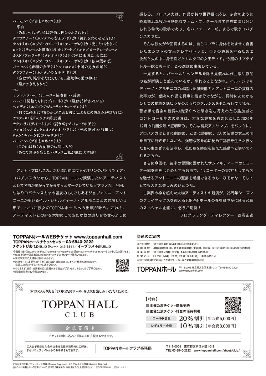 2024年12月、TOPPANホール初登場ながら鮮烈なハイドンを聞かせ会場を熱狂の渦に巻き込んだ、アントニーニ率いるイル・ジャルディーノ・アルモニコ。そんな彼らが今回は、異才と呼ぶべきソプラノ歌手、アンナ・プロハスカとともに再登場します。プログラムは、バロック・オペラの諸作品から、クレオパトラとカルタゴのディドーネに焦点をあてたアリアを演奏。劇性のある音楽には特別な能力を発揮するアントニーニ&イル・ジャルディーノ・アルモニコだけに、TOPPANホールの空間をところ狭しとドラマティックな音楽が飛び交うことは請け合いです。リコーダーの名手でもあるアントニーニのもう一つの才能を楽しめるのも、さらに贅沢なひとときになるでしょう。