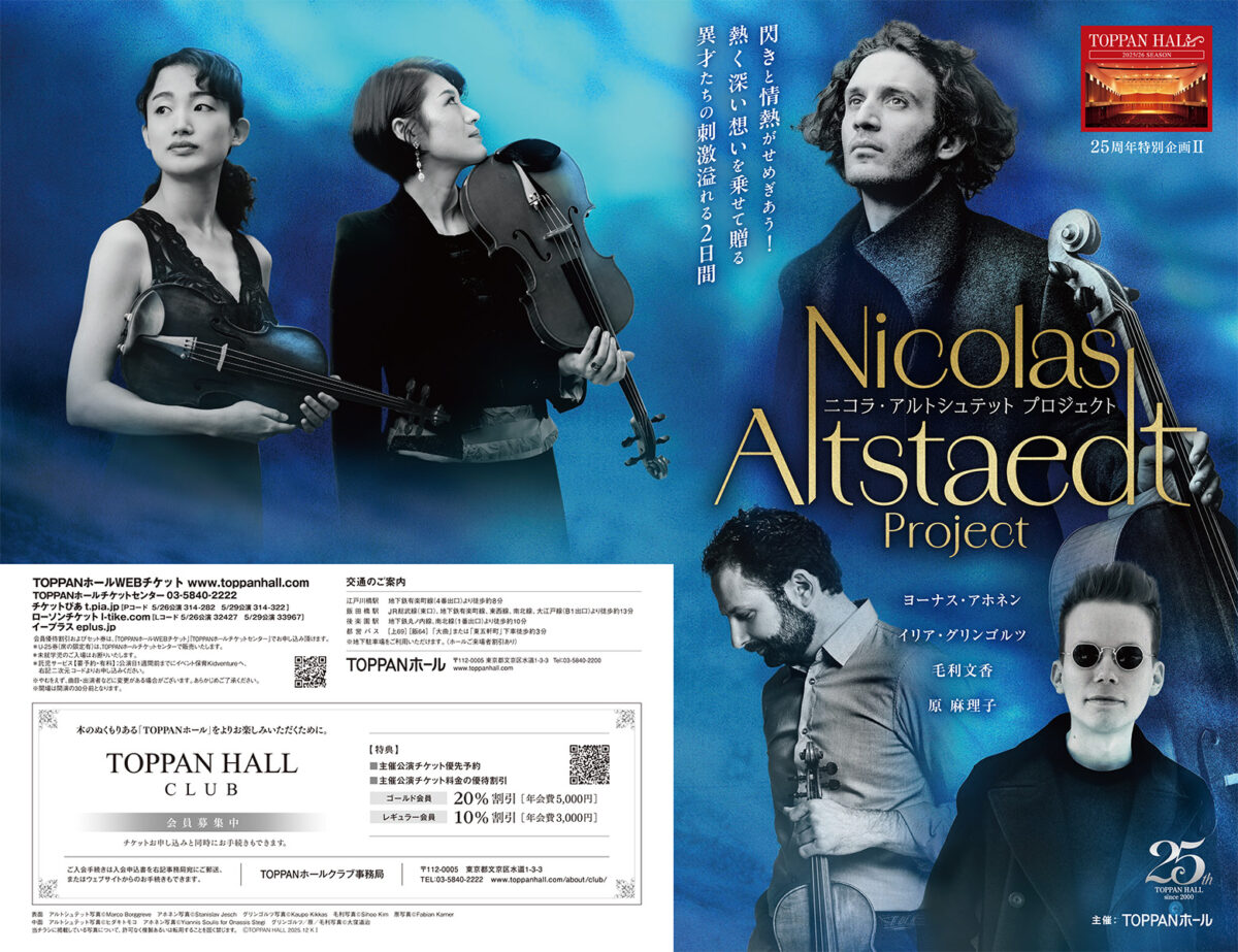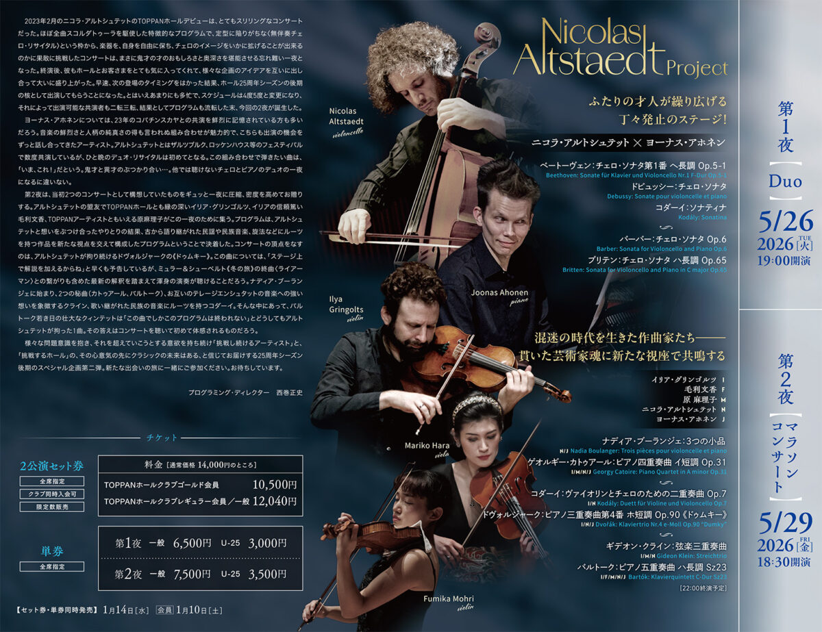 TOPPANホール25周年シーズン後半の大きな目玉となる、アルトシュテットプロジェクト。2023年に忘れ難い無伴奏を聴かせてくれたアルトシュテットを中心に、第1夜はアホネンとのデュオをお届けします。アルトシュテットらしく、同時に極めてアホネンらしいプログラムで、強烈な個性を振りかざすがごとくの丁々発止のバトル・デュオをお楽しみください。つづく第2夜は、マラソンコンサートの体をとった「一夜だけのフェスティバル」とでも言うべき新たな試みです。アルトシュテットの主要な関心事であり活動テーマのひとつ―退廃音楽や東欧音楽の復権、再評価―を共有し、非常に意義深いプログラムになりました。《ドゥムキー》に秘められた想いに触れ、クラインやカトゥアールに想いを馳せる。若き日のバルトークのピアノ五重奏曲も、一流の奏者によるライヴ体験は極めて珍しいはずです。あたかもヨーロッパの小さな音楽祭に足を踏み入れた気分で、この一夜限りのマラソンコンサートを楽しんでください。