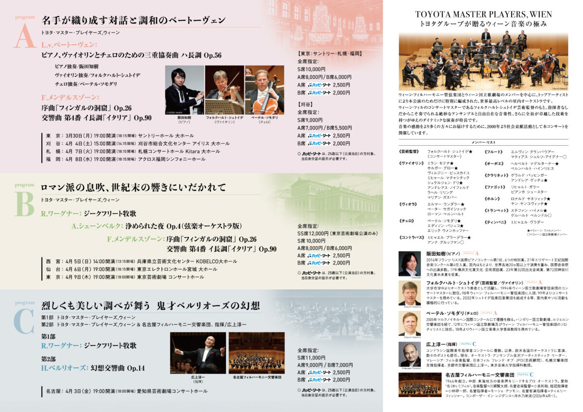 トヨタ自動車をはじめ、トヨタグループおよびトヨタ自動車北海道は、2000年より「音楽の力によって感動と笑顔をより多くの方々に届けたい」との想いのもと、ウィーン・フィルハーモニー管弦楽団およびウィーン国立歌劇場のメンバーを中心に特別編成されたオーケストラによるコンサートを、全国7都市8公演で開催しています。