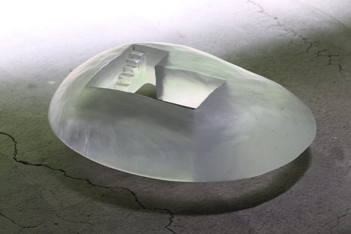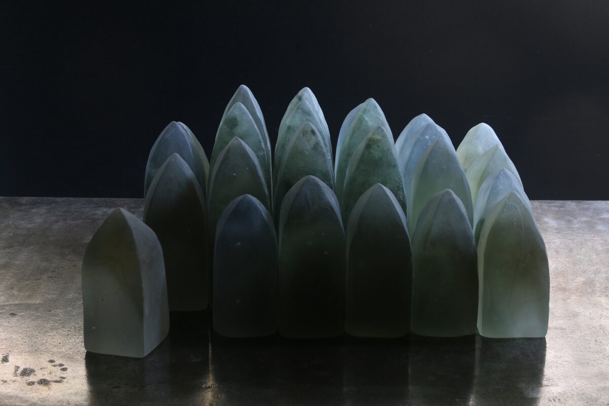 ガラス作家・塩谷直美さんは多摩美術大学でガラス工芸に出会い、卒業後に工房を構え独立しました。1993年フランス国際ガラス造形センターに職を得て渡仏し、コールドキャスト技法によるオブジェ制作を始めました。コールドキャストは、粘土やワックスなどで作品の原型を作り耐火石膏をかけて硬化した後、原型を取り除いた鋳型に粉砕したガラス片を詰めて窯の中で焼成溶融してガラスを一体化させる技法です。ガラスを取り出すときに型を壊すため出来上る作品は一品ものとなります。