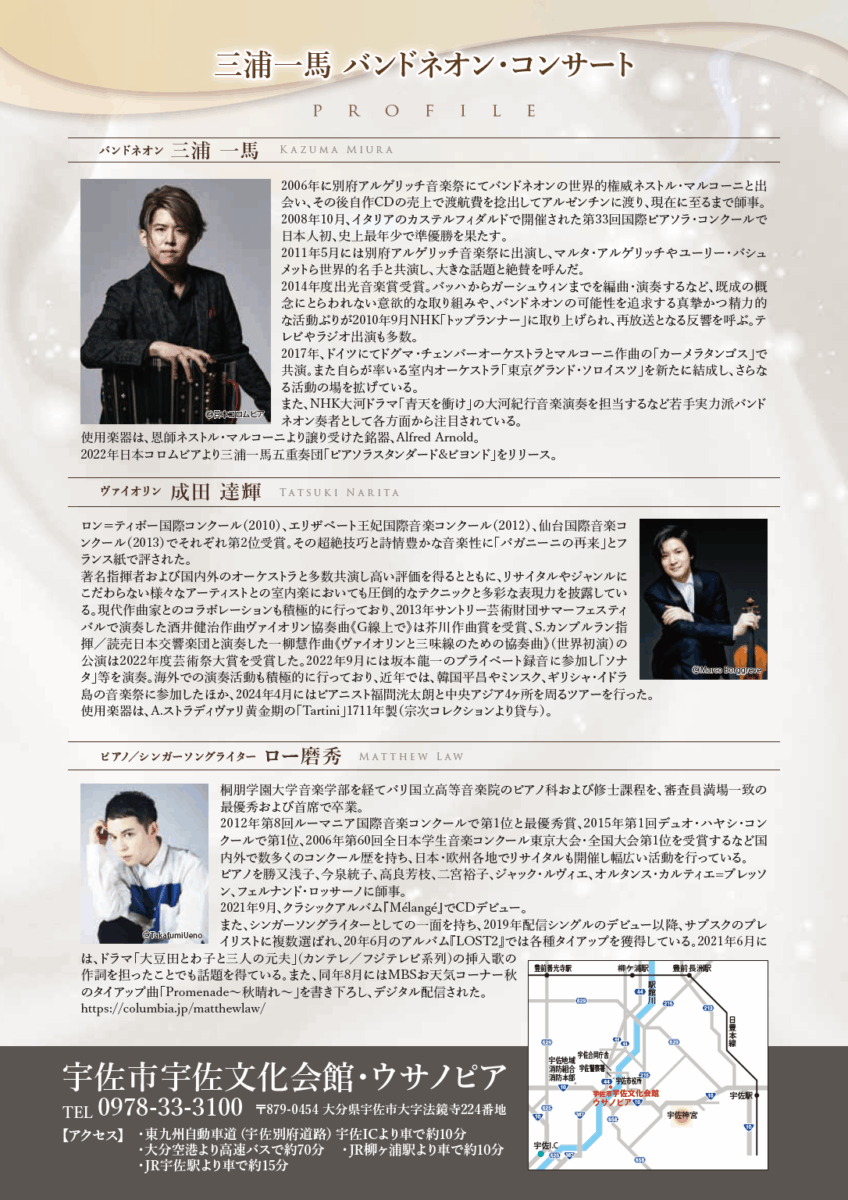 ■出演:三浦一馬(バンドネオン)、成田達輝(ヴァイオリン)、ロー磨秀(ピアノ/シンガーソングライター)